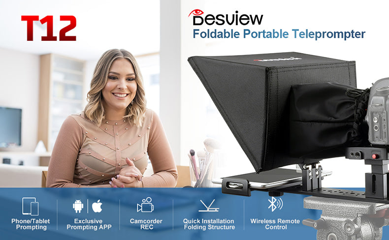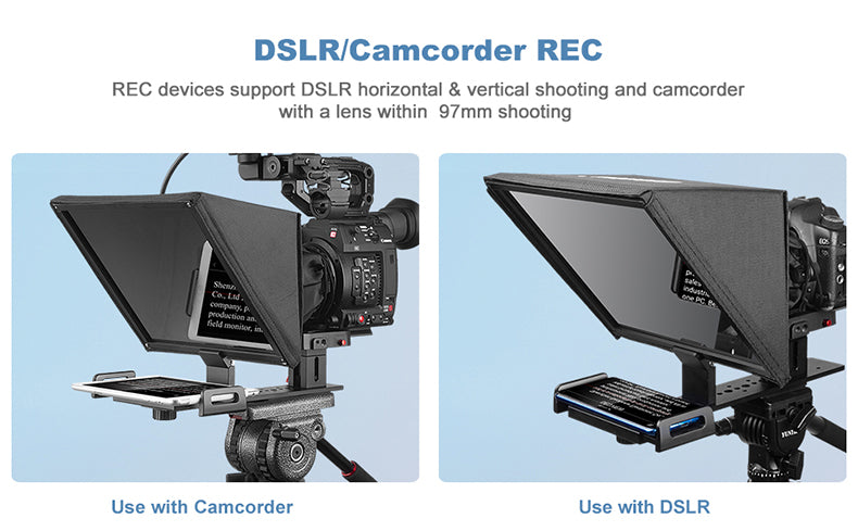- T12 teleprompter supports DSLR cameras recording vertically and horizontally and camcorders recording horizontally;