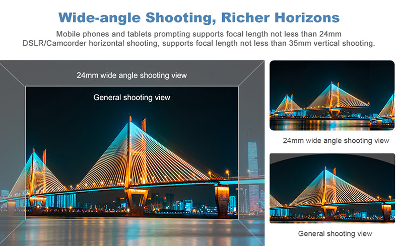 The teleprompter DSLR&Tablet prompting mode supports more than 24mm horizontal/ shooting and less than