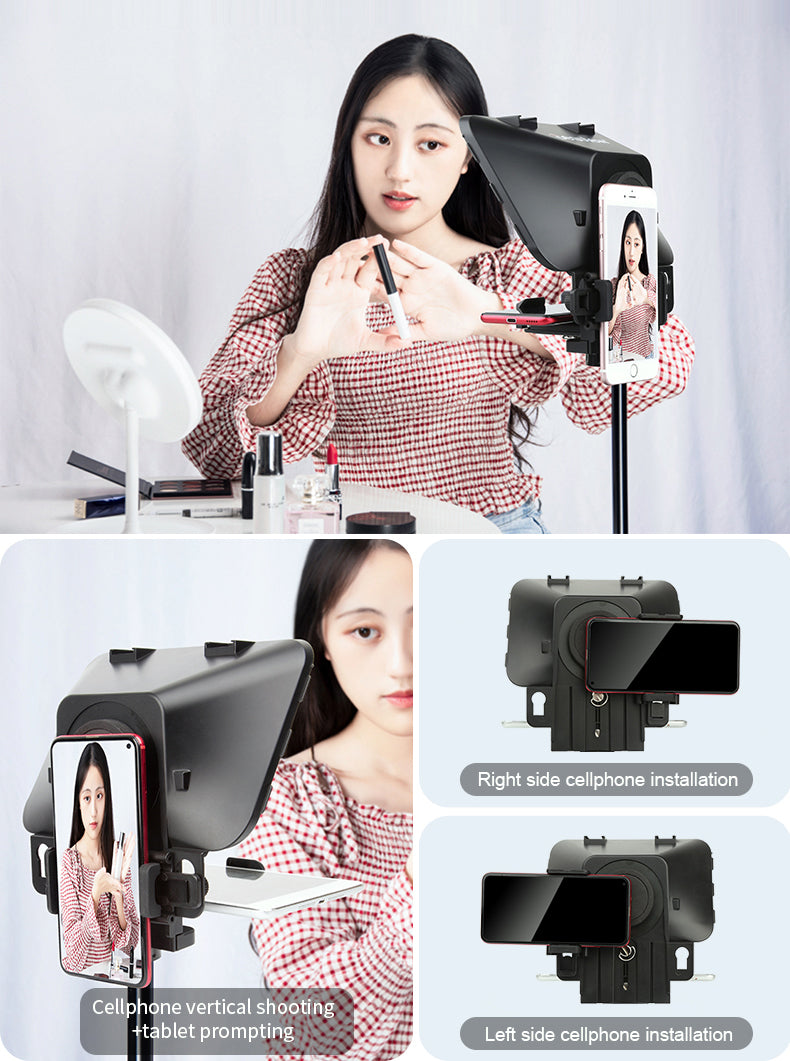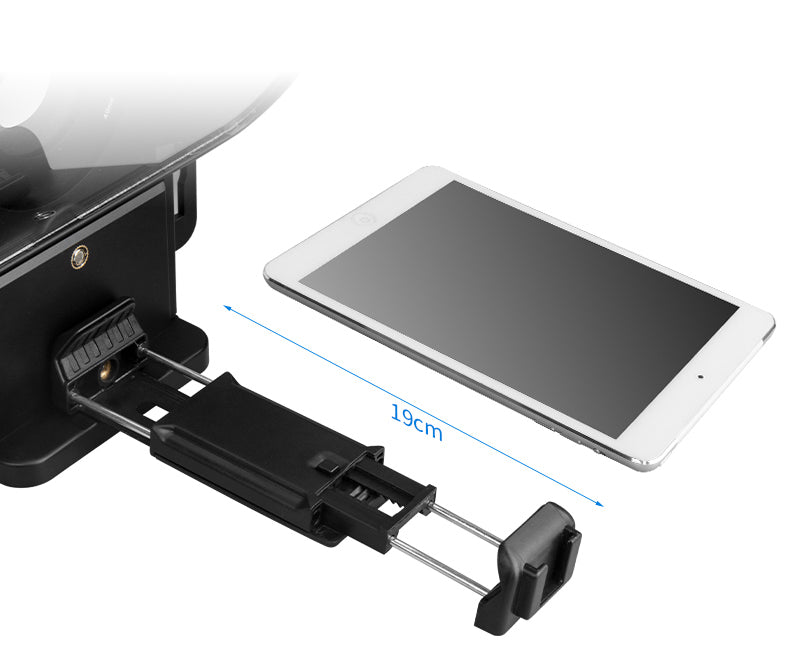 Max 19cm length four-section retractable cellphone & tablet clamp can support 11 inches tablet as teleprompter device.
