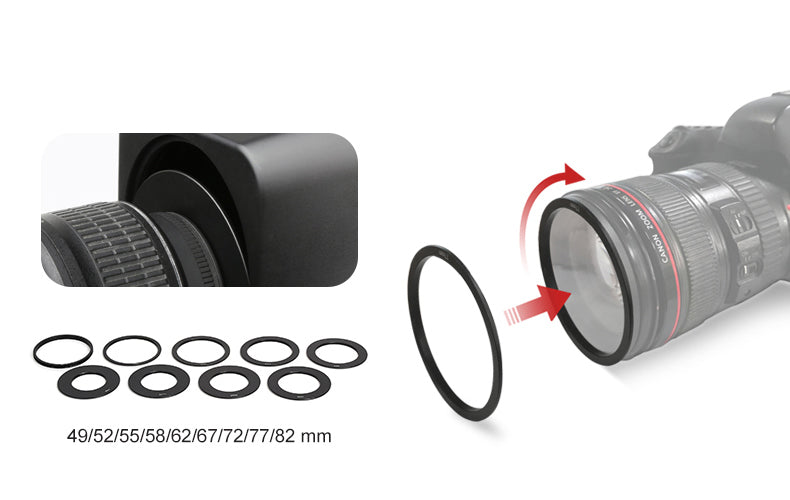 - Equipped with 49/52/55/58/62/67/72/77/82mm Lens Adapter Rings
